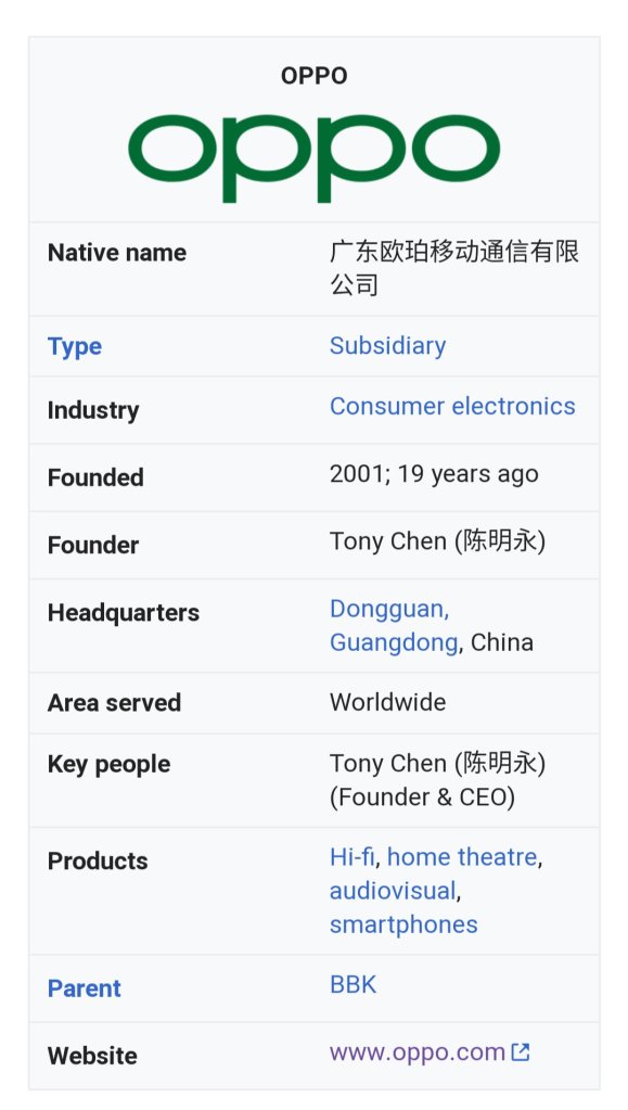 Guangdong OPPO Mobile Telecommunications Corp., Ltd, commonly referred to as OPPO, is a Chinese consumer electronics and mobile communications company headquartered in Dongguan, Guangdong, in China, and known for its smartphones, Blu-ray players and other electronic devices. A leading manufacturer of smartphones,[1] OPPO was the top smartphone brand in China in 2019 and was ranked No. 5 worldwide.[2] It is a subsidiary of BBK Electronics. It is a part of BBK Electronics Corporation along with OnePlus, Vivo and Realme.