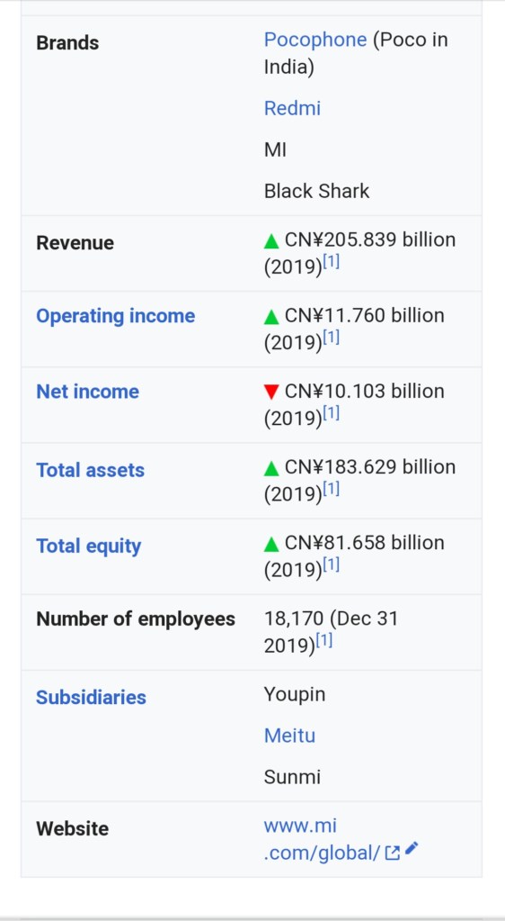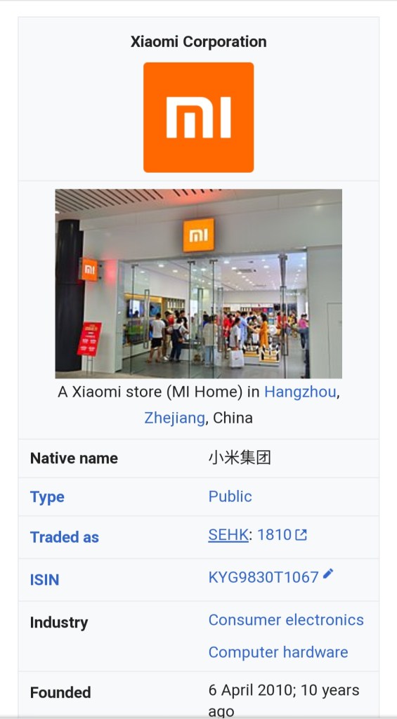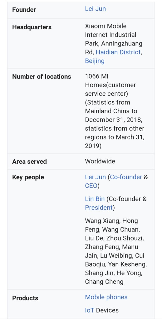 Xiaomi has 16,700 employees[15][failed verification] worldwide. It is expanding to other markets including Greater China, India, Japan, Russia, South Korea, South Africa and most countries and regions in Southeast Asia and Western Europe.[16][17] According to Forbes magazine, Lei Jun, the founder and CEO, has an estimated net worth of US$12.5 billion.[18] Xiaomi is the world’s 4th most valuable technology start-up after receiving US$1.1 billion funding from investors, making Xiaomi’s valuation more than US$46 billion.[19] Ranked 468th, Xiaomi is the youngest company on Fortune Global 500 list for 2019.[20] In 2019, Xiaomi’s mobile phone shipments reached 125 million units,[21] ranking fourth globally and first in India since 2018. The company was listed at the Hong Kong Stock Exchange since 2018.
